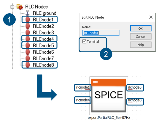 比如这里有两条平行的线,通过设置多个Node可以就可以分开计算并得到独立的RLCG寄生参数,比如走线本身的自感,电阻。平行走线之间的电容,走线和走线之间的互感和互容等,但实际的Spice模型我们只需要1#4#5#8#,四个对外的引脚,我们可以仅仅对那四个Node设置terminal,如下图所示: