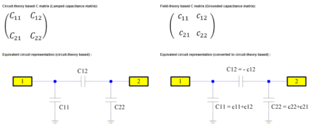 对于这里提供的节点电容补充一句,如果要计算整个线的对地电容,则需要把C1,C2,C3,C4加起来。而要计算两条线之间的电容则是需要把C48,C37,C26, C16以及更多的交叉电容都加起来。更多可参考CST帮助文档对于电容矩阵的解释,如下图: