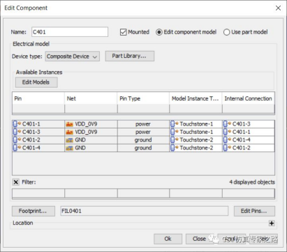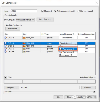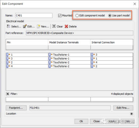 我们以单独一个器件需要设置三端子电容为例,首先打开下图中的C401,由于是一个三端子电容通常有四个pin: