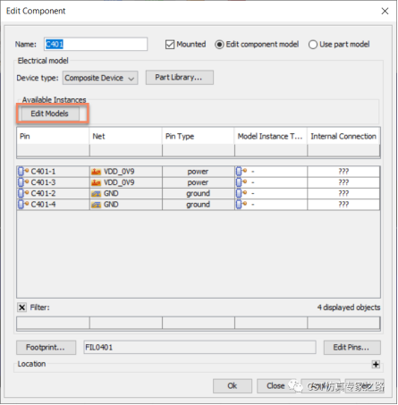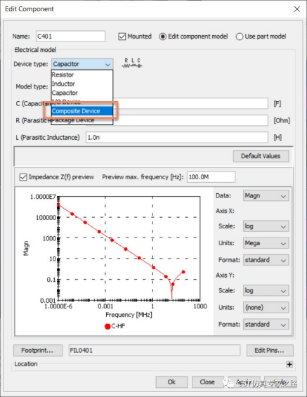 如果不用Part model(封装模型),就点击Edit component model。(上图中的结果其实已经设置完了三端子电容。)点击Composite Device,注意这是最关键的一步,由于是四个pin的三端子电容,所以这里需要用这个Device type。
