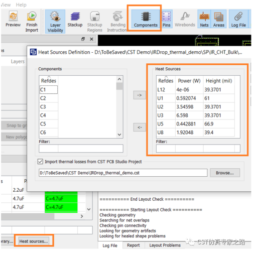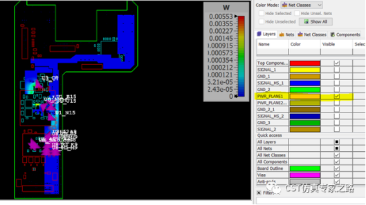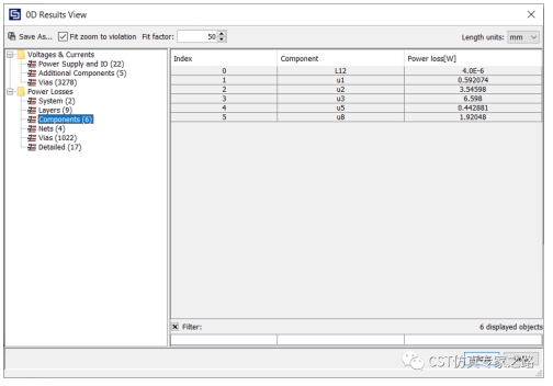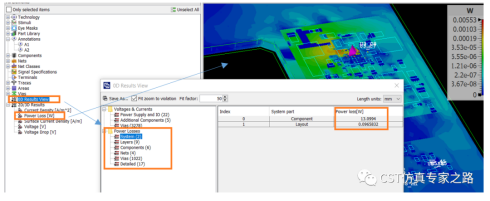 CST中IR drop仿真之后,可见损耗列表,具体到哪个元件,哪一层,哪个线路,哪个过孔,各消耗多少功率,进行了热转换。
