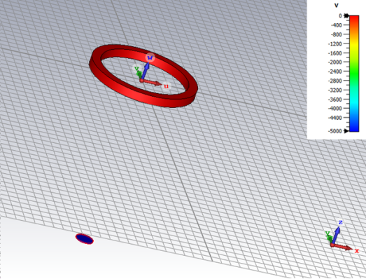 然后定义两个电势差,圆柱Emission为potential1 = -5000V,蓝色阴极;圆环Anode为potential2=0V,红色阳极。