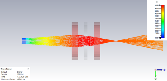 将线圈coil1 复制一个在阳极圆环后面。开始仿真,仿真结束后可看到电子束焦点。
