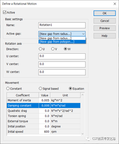 接下来定义转动区域,运动方程中,惯性矩为0.005,阻尼0.008,初始速度600转/分,其他为零。