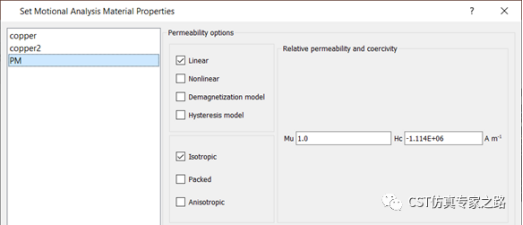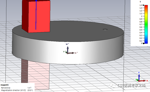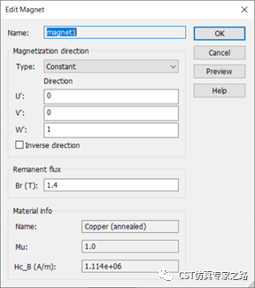 Step 2. 定义磁场源(磁铁),CST用1.4T,Z+方向。这个是线性的剩磁,用公式B= mu0 * muR * H可算出对应的线性矫顽力-1.114E-6。方向为体积方向和全局方向相同时的Z方向。