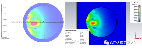 还不放心就看电流密度,下面是0.2秒时的电流密度,相同平面,相同区间值,能看出两个涡流圈(一对小蓝点)。