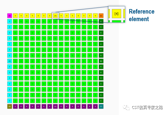 比如如下的大型天线阵列,我们可假设相同颜色的天线由于位置近似,属于一个group分组,其结果可复制粘贴,这样我们只需要计算9个单元天线作为参考就可以了(9个颜色)。
