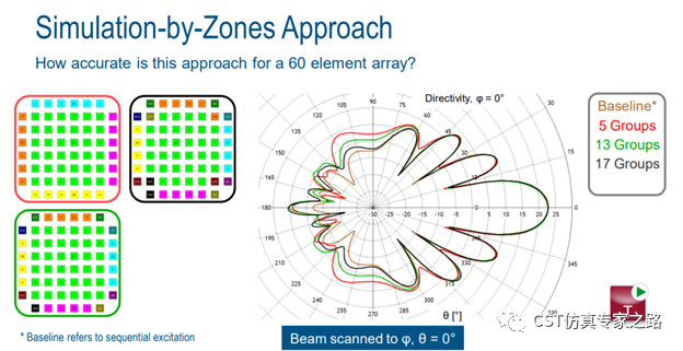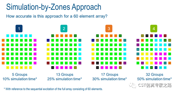 CST的阵列天线可以使用时域求解器,比如FIT或TLM,同时激励(simultaneous)或分别激励(sequence)均可。但是时域的一大问题就是端口较多的时候,分别激励端口耗时较长,效率不高,所以这里我们可以考虑使用划区法(simulation by zones)。该方法可以提高仿真效率,因为是属于分别激励方法的估算版本(Group Sequential Excitation),优势就是分别激励的优势 --- 可将任何激励或波束的形成都放到后处理。