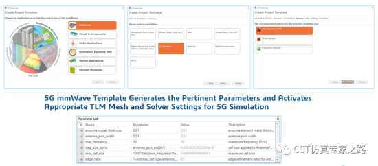 之前视频中我们能够注意到,TLM的网格可由一些参数来控制,这些参数是5G毫米波模板帮助定义的。该模板生成一些本地的网格组(mesh group),用户只需要将端口和天线拖拽到这些组里面就可以了,这些组自动利用这些模板定义的参数对里面的结构进行网格加密。至于如何调整供应商提供的加密天线模组的网格,这个我们有其他的guide。