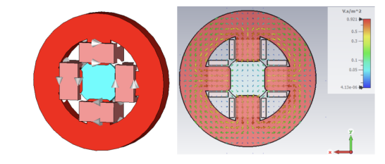 CST工作室中的静磁求解器(Ms Solver)可以用来设计线圈和磁体,下图所示的四极磁体通常用于加速器中,用来聚焦粒子束。在CST软件中完成建模和仿真后,得到磁感应强度B的三维分布图;还可以通过后处理提取磁感应强度B沿着圆周变化的曲线。