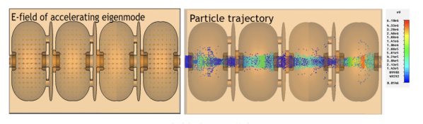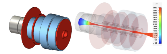 加速器是一种利用电磁场加速带电粒子至高能量的设备。加速器组件的设计会更为复杂,例如下图所示的直线加速器,我们首先会用到本征模求解器(Eigenmode Solver)进行超导腔体仿真,研究本征模和失谐;然后采用PIC Solver进行次级电子倍增效应仿真;最后采用Wakefield Solver进行尾场分析。