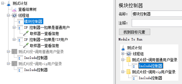 模块控制器与include控制器的不同在于,include控制器是直接引入外部文件中的测试片段。模块控制器引入的是当前测试计划中定义的测试片段,可以通过include控制器间接引入外部文件中的测试片段。