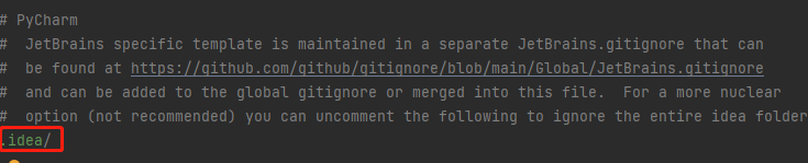 可以看到文件的最下方有这么一段话,可以取消.idea/的注释,从而屏蔽所有.idea文件夹下的内容
