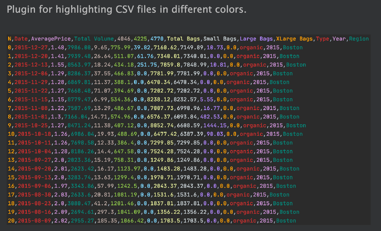 用于通过灵活的表编辑器编辑 csv、tsv、psv文件的语法验证,结构突出显示,可自定义的颜色,新意图和有用的检查。如下图所示