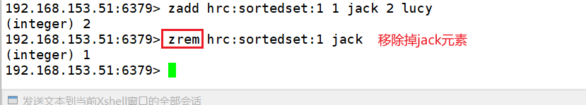 2. ZREM key member:删除 sorted set中的一个指定元素