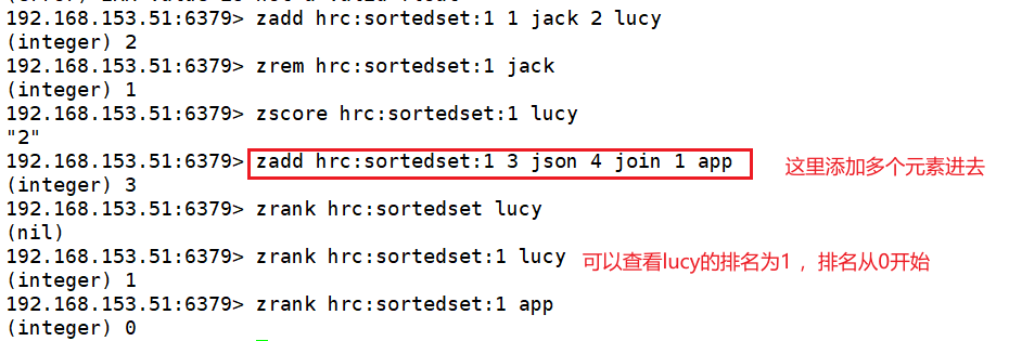 4. ZRANK key member:获取sorted set 中指定元素的排名