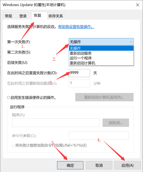 6.然后选择上面的恢复,第一次失败改成无操作,下面的都是改成无操作,天数改成9999天,点击应用,点击确认,