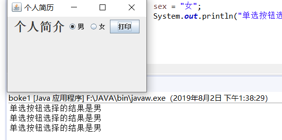 //单选按钮判定,获取性别 if (male.isSelected())//选择第一个 { sex = "男"; System.out.println("单选按钮选择的结果是"+sex); } else//因为是两个选择的单选组中,那么一定是 { sex = "女"; System.out.println("单选按钮选择的结果是"+sex); }