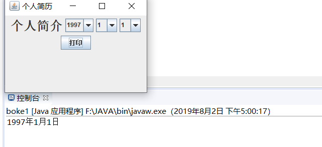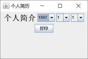 //生日使用下拉列表 String nian[] = {"1997","1998","1999","2000","2001","2002"}; JComboBox cb1 = new JComboBox(nian); String yue[] = {"1","2","3","4","5","6","7","8","9","10","11","12"}; JComboBox cb2 = new JComboBox(yue); String ri[] = {"1","2","3","4","5","6","7","8","9","10", "11","12","13","14","15","16","17","18","19","20", "21","22","23","24","25","26","27","28","29","30","31"}; JComboBox cb3 = new JComboBox(ri); face.add(intro); face.add(cb1); face.add(cb2); face.add(cb3);