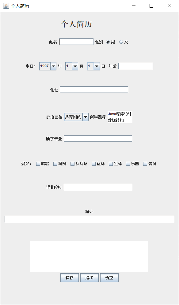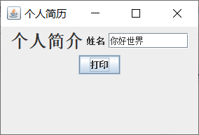 //添加一个标签 JLabel intro = new JLabel("个人简介"); //根据题目要求我们需要,调节字体大小 intro.setFont(new Font("宋体",Font.BOLD,25)); face.add(intro); //中间容器添加标签 sh.add(face); //顶层容器添加中间容器