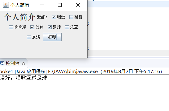 String aihao = "爱好:"; if(chang.isSelected()) { aihao += "唱歌"; } if(tiao.isSelected()) { aihao = aihao + "跳舞"; } if(ping.isSelected()) { aihao = aihao + "乒乓球"; } if(lan.isSelected()) { aihao = aihao + "篮球"; } if(zu.isSelected()) { aihao = aihao + "足球"; } if(yueqi.isSelected()) { aihao = aihao + "乐器"; } if(biao.isSelected()) { aihao = aihao + "表演"; } System.out.println(aihao);