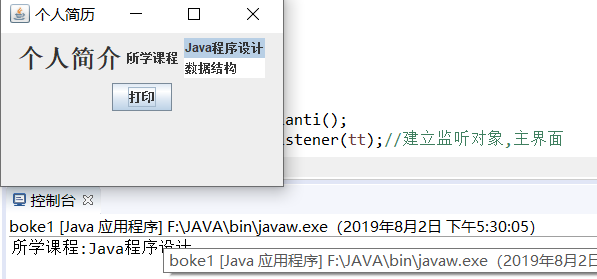//所学课程列表框 JLabel lbl_kecheng =new JLabel("所学课程"); String[] coursesNames = {"Java程序设计","数据结构"}; JList course = new JList(coursesNames); face.add(lbl_kecheng); face.add(course); //取出值方式 System.out.println("所学课程:"+(String)course.getSelectedValue()+" ");