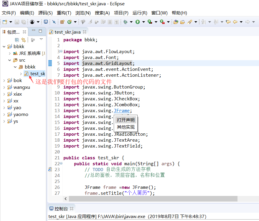 可以右击这个.java文件,也可以右击这个bkbk的包,因为有的程序我们需要一些其他的比如父类或者是其他接口,