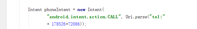 //监听猪哥的按钮这个类 public void clickk_1(View source) { TextView tv1 = (TextView)findViewById(R.id.tt2); tv1.setText("黑猪尹"); //吐司实现能够友好的给客户提示 Toast.makeText(MainActivity.this, "开始给猪哥打电话", Toast.LENGTH_SHORT).show(); //试图给猪哥打电话 //新建一个意图 Intent intent = new Intent(); //确认意图的种类是想打电话 intent.setAction(Intent.ACTION_CALL); //确定打电话的号码 intent.setData(Uri.parse("tel:" + 573924));//number 可以替换为固定的电话 //开启意图 startActivity(intent); }