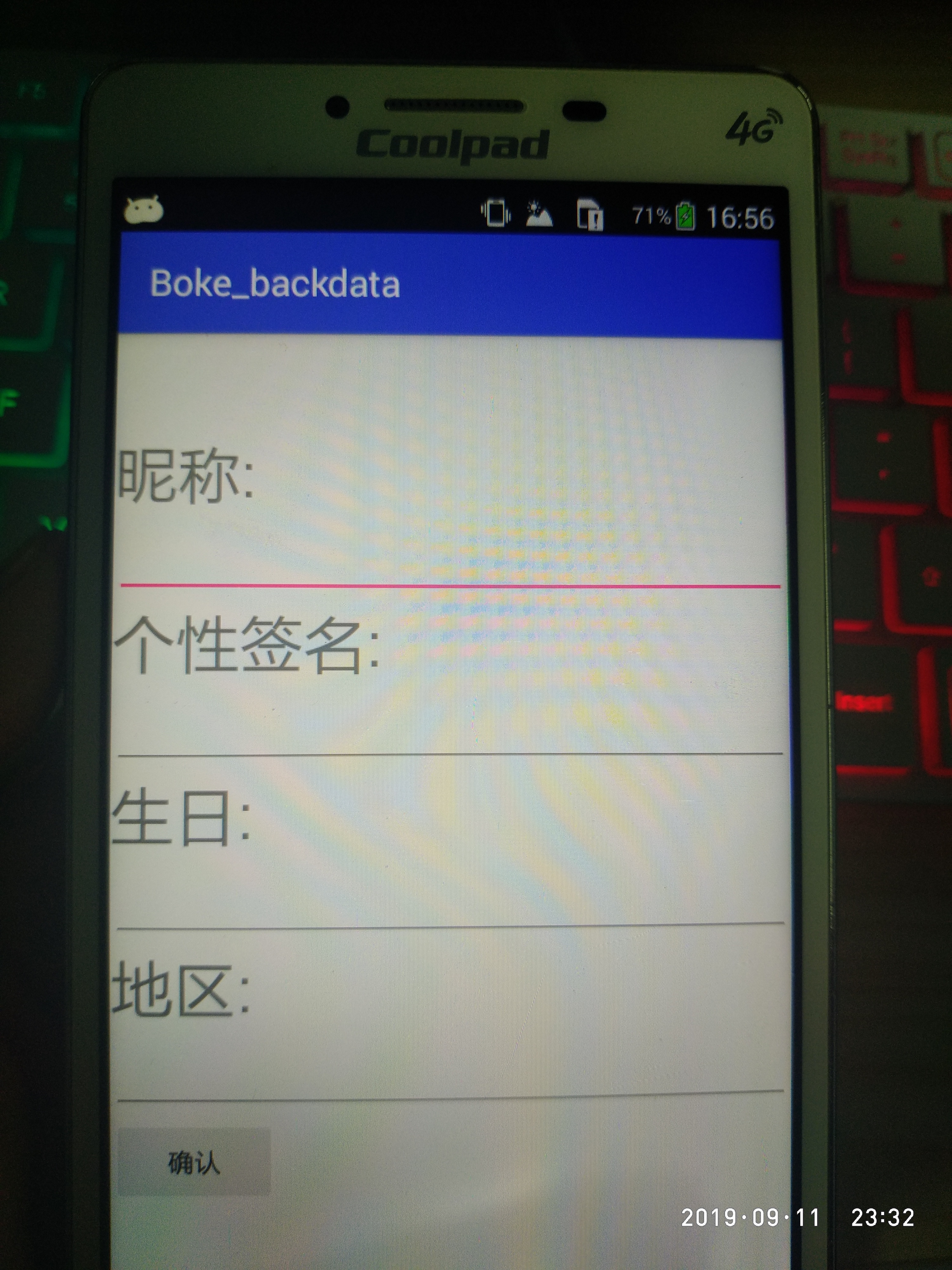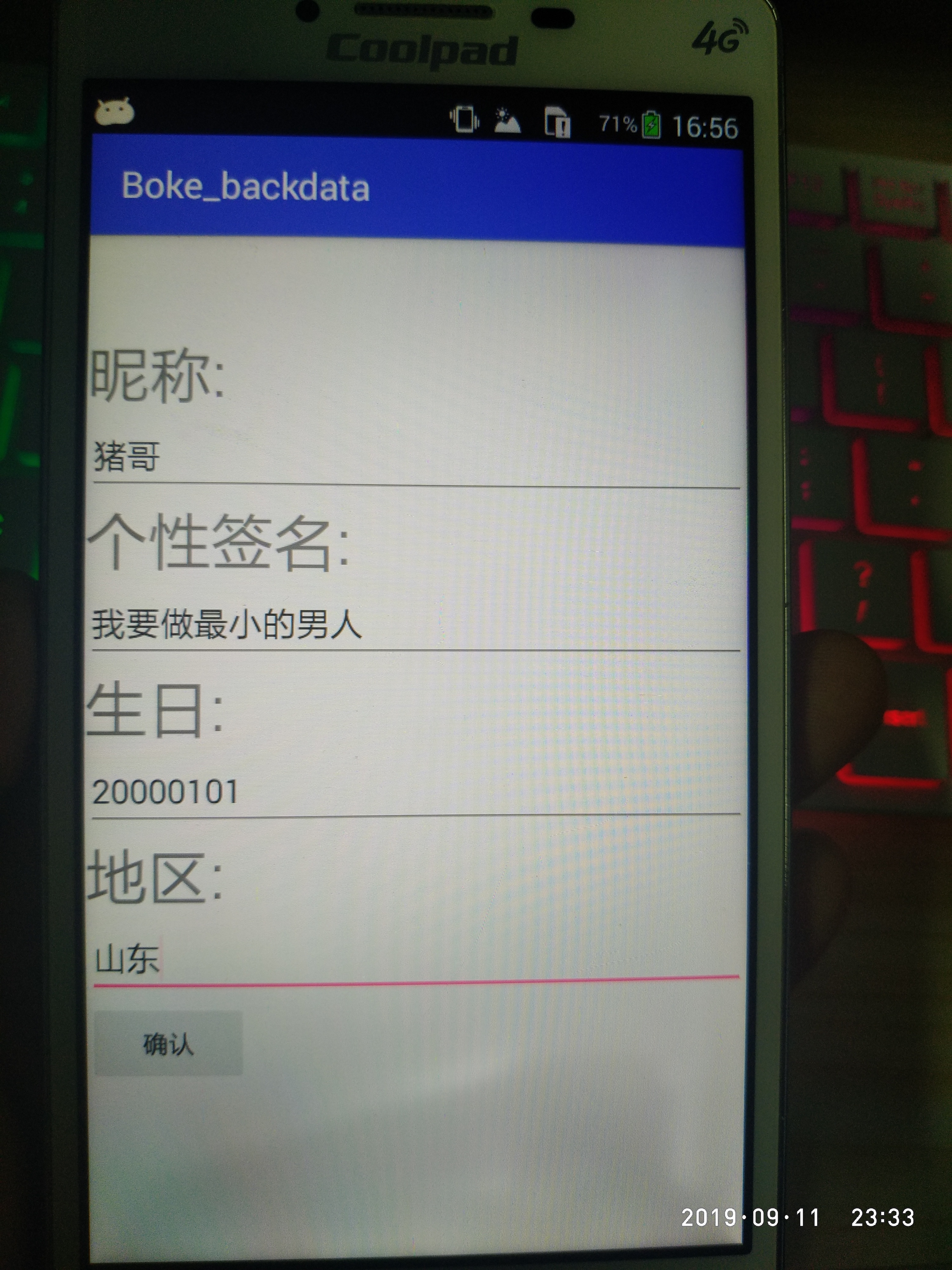 <?xml version="1.0" encoding="utf-8"?> <LinearLayout xmlns:android="http://schemas.android.com/apk/res/android" android:layout_width="match_parent" android:layout_height="match_parent" android:orientation="vertical" > <TextView android:id="@+id/tv0" android:layout_width="wrap_content" android:layout_height="wrap_content" android:text="请输入基本信息:" android:textSize="60px" android:textColor="@color/abc_background_cache_hint_selector_material_dark" /> <TextView android:id="@+id/tv1" android:layout_width="wrap_content" android:layout_height="wrap_content" android:text="昵称:" android:textSize="50px" /> <EditText android:id="@+id/et1" android:layout_width="match_parent" android:layout_height="wrap_content" /> <TextView android:id="@+id/tv2" android:layout_width="wrap_content" android:layout_height="wrap_content" android:text="个性签名:" android:textSize="50px" /> <EditText android:id="@+id/et2" android:layout_width="match_parent" android:layout_height="wrap_content" /> <TextView android:id="@+id/tv3" android:layout_width="wrap_content" android:layout_height="wrap_content" android:text="生日:" android:textSize="50px" /> <EditText android:id="@+id/et3" android:layout_width="match_parent" android:layout_height="wrap_content" /> <TextView android:id="@+id/tv4" android:layout_width="wrap_content" android:layout_height="wrap_content" android:text="地区:" android:textSize="50px" /> <EditText android:id="@+id/et4" android:layout_width="match_parent" android:layout_height="wrap_content" /> <Button android:id="@+id/bu_back" android:layout_width="wrap_content" android:layout_height="wrap_content" android:text="确认" /> </LinearLayout>