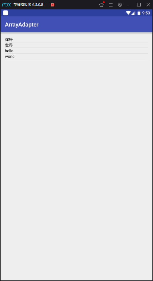 package com.example.xialm.arrayadapter; import android.support.v7.app.AppCompatActivity; import android.os.Bundle; import android.widget.ArrayAdapter; import android.widget.ListView; public class MainActivity extends AppCompatActivity { @Override protected void onCreate(Bundle savedInstanceState) { super.onCreate(savedInstanceState); setContentView(R.layout.activity_main); //找到关心的控件 ListView ll = (ListView)findViewById(R.id.lv_1); //定一个数组为了加进去 String objects[] = {"你好","世界","hello","world"}; //搞一个数组适配器,将数组里面的内容展示到我们的listview上 //但是我们的这个适配器有一个局限性,智能显示一个textview,要实现更多的功能还是需要使用复杂一点的适配器, ArrayAdapter<String> myadd = new ArrayAdapter<String>(getApplicationContext(), R.layout.item, R.id.tv_name,objects); //ArrayAdapter<String> myadd1 = new ArrayAdapter<String>(getApplicationContext(), R.layout.item, R.id.tv_number,objects); //设置数据适配器 ll.setAdapter(myadd); //ll.setAdapter(myadd1); } }