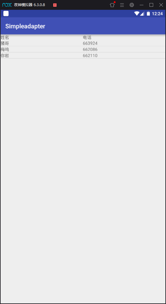 <?xml version="1.0" encoding="utf-8"?> <RelativeLayout xmlns:android="http://schemas.android.com/apk/res/android" xmlns:tools="http://schemas.android.com/tools" android:layout_width="match_parent" android:layout_height="match_parent" tools:context="com.example.xialm.simpleadapter.MainActivity"> <LinearLayout android:id="@+id/ll" android:layout_width="match_parent" android:layout_height="wrap_content"> <TextView android:id="@+id/tv_1" android:layout_width="match_parent" android:layout_height="wrap_content" android:layout_weight="1" android:text="姓名" /> <TextView android:id="@+id/tv_2" android:layout_width="match_parent" android:layout_height="wrap_content" android:layout_weight="1" android:text="电话" /> </LinearLayout> <ListView android:layout_width="match_parent" android:layout_height="match_parent" android:id="@+id/lv_1" android:layout_below="@+id/ll" > </ListView> </RelativeLayout>
