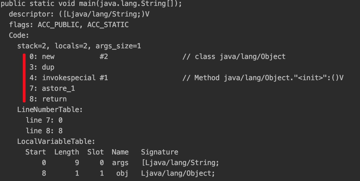 main() 方法对应的字节码: