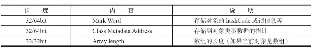 在 32 位系统下,存放 Class 指针的空间大小是 4 字节,Mark Word 空间大小也是4字节,因此头部就是 8 字节,如果是数组就需要再加 4 字节表示数组的长度,如下表所示: