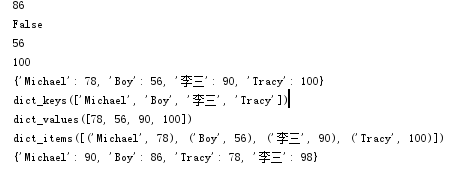 classmates=['Michael','Boy','Tracy','李三','Tom'] scores=[90,86,78,98] d={'Michael':78,'Boy':98,'李三':90,'Tom':86} print(d['Tom']) print('Tomas'in d) c=d['Boy']=56 print(c) f=d['Tracy']=100 print(f) d.pop('Tom') print(d) print(d.keys()) print(d.values()) print(d.items()) print(dict(zip(classmates,scores)))