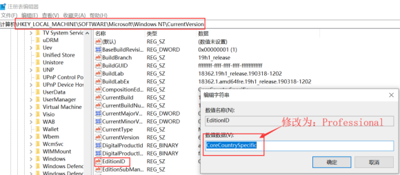 由于家庭版的系统不支持Docker Desktop版本的安装,所以我们得把家庭版伪装成专业版从 而绕过软件的检测。 步骤很简单,在cmd命令中运行regedit,打开注册表,按照以下路径找到相应的位置进行修 改。 路径: HKEY_LOCAL_MACHINE\software\Microsoft\WindowsNT\CurrentVersion 点击current version,在右侧找到EditionId,右键点击EditionId 选择“修改”,在弹出的 对话框中将第二项“数值数据”的内容改为Professional,然后点击确定。