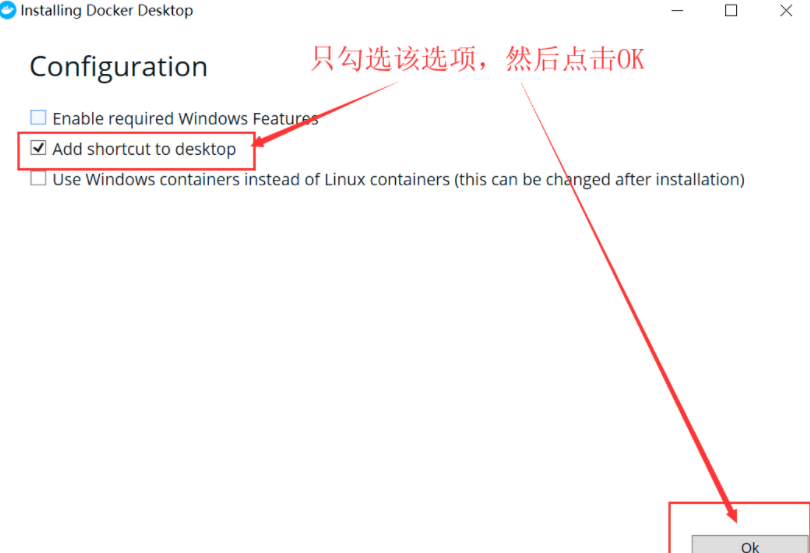 首先需要下载Docker desktop 安装包。安装包下载之后双击即可安装,切记以下选项只能勾第二个,其他不要选。 安装完成后,Docker 会自动启动。通知栏上会出现个小鲸鱼的图标,这表示 Docker 正在运 行。如果没启动,你可以点击桌面快捷方式打开Docker