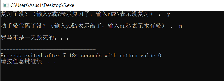 #include<stdio.h> int main(){ char ans1,ans2; printf("复习了没?(输入y或Y表示复习了,输入n或N表示没复习) : "); ans1 = getchar(); getchar(); printf("\n动手敲代码了没?(输入y或Y表示敲了,输入n或N表示木有敲) : "); ans2 = getchar(); if((ans1=='y'||ans1=='Y') && (ans2=='y'||ans2=='Y')) printf("\n罗马不是一天建成的:)\n"); else printf("\n罗马不是一天毁灭的。。。\n"); return 0; }