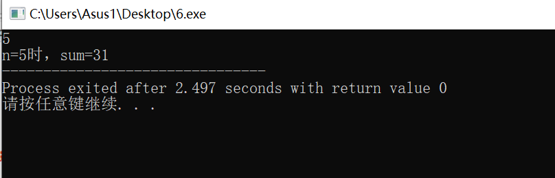 #include <stdio.h> #include <math.h> int main(){ int sum; double a=2,n,b; scanf("%lf",&n); b=pow(a,n); sum=1*(1-b)/(1-2); printf("n=%.0lf时,sum=%d",n,sum); return 0; }
