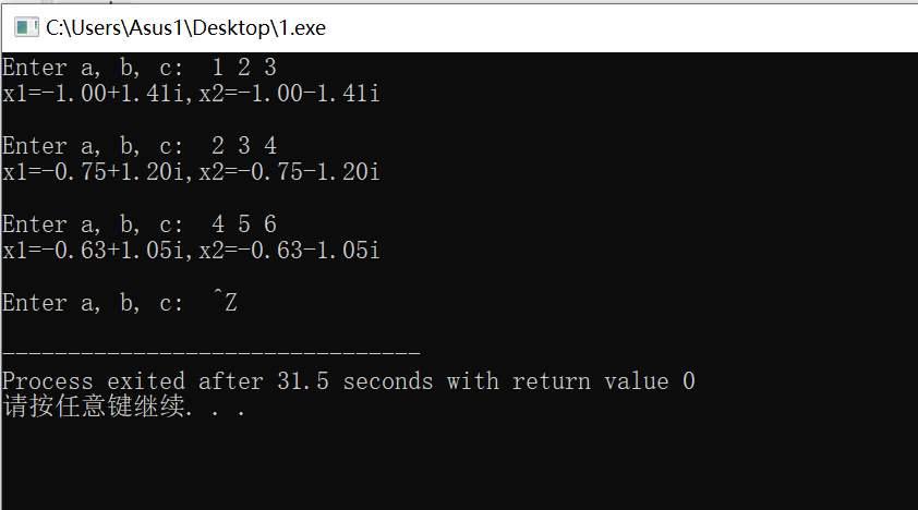 #include<math.h> #include<stdio.h> int main(){ float a,b,c,x1,x2; float delta,real,imag; printf("Enter a, b, c: "); while(scanf("%f%f%f",&a,&b,&c)!=EOF){ if(a==0) printf("not quadratic equation.\n\n"); else{ delta=b*b-4*a*c; if(delta>=0){ x1=(-b+sqrt(delta))/(2*a); x2=(-b-sqrt(delta))/(2*a); printf("x1=%.2f,x2=%.2f\n\n",x1,x2); } else{ real=-b/(2*a); imag=sqrt(-delta)/(2*a); printf("x1=%.2f+%.2fi,x2=%.2f-%.2fi\n\n",real,imag,real,imag); } } printf("Enter a, b, c: "); } return 0; }