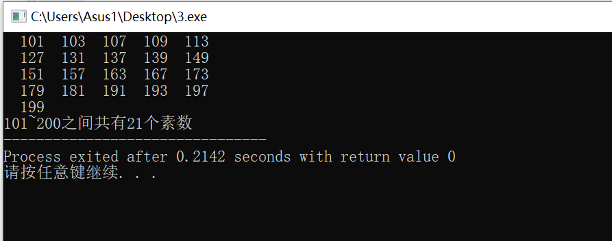 #include<stdio.h> #include<math.h> #include<stdlib.h> int main(){ int a,i,n,m; for(n=101,a=0;n<=200;n++){ m=sqrt(n); for(i=2;i<=m;i++) if(n%i==0)break; if(i>m){ printf("%5d",n); a++; if(a%5==0) printf("\n"); } //else //continue; } printf("\n101~200之间共有%d个素数",a); return 0; }