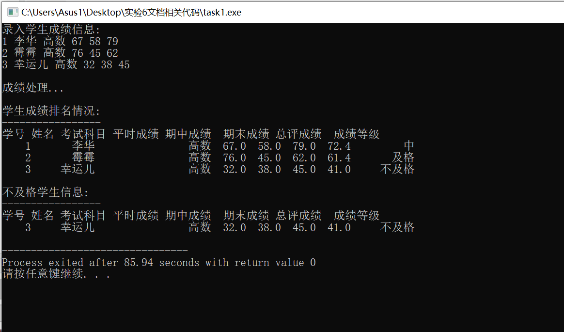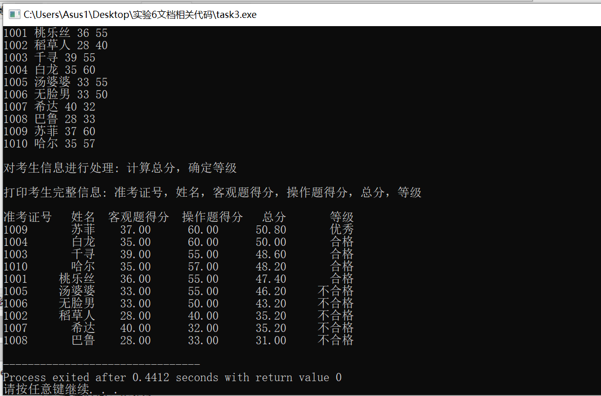 printf("\n打印考生完整信息: 准考证号,姓名,客观题得分,操作题得分,总分,等级\n");
