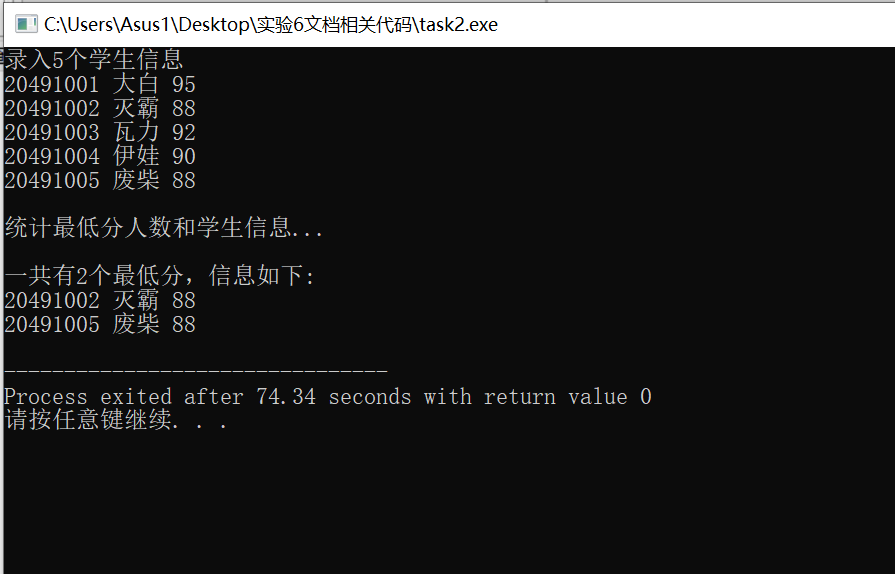 printf("\n一共有%d个最低分,信息如下:\n", count);