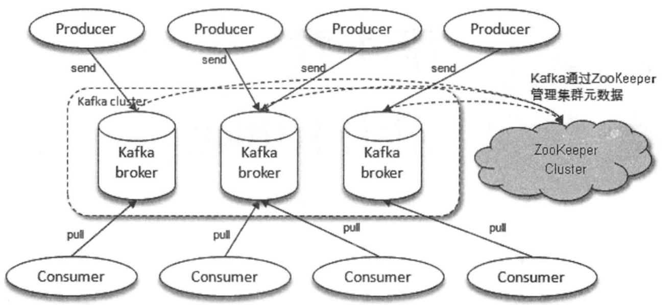 这幅图可以看到 Kafka 基本组成,中间就是 Kafka 集群,一般最少3个。Kafka 通常有这几个角色: