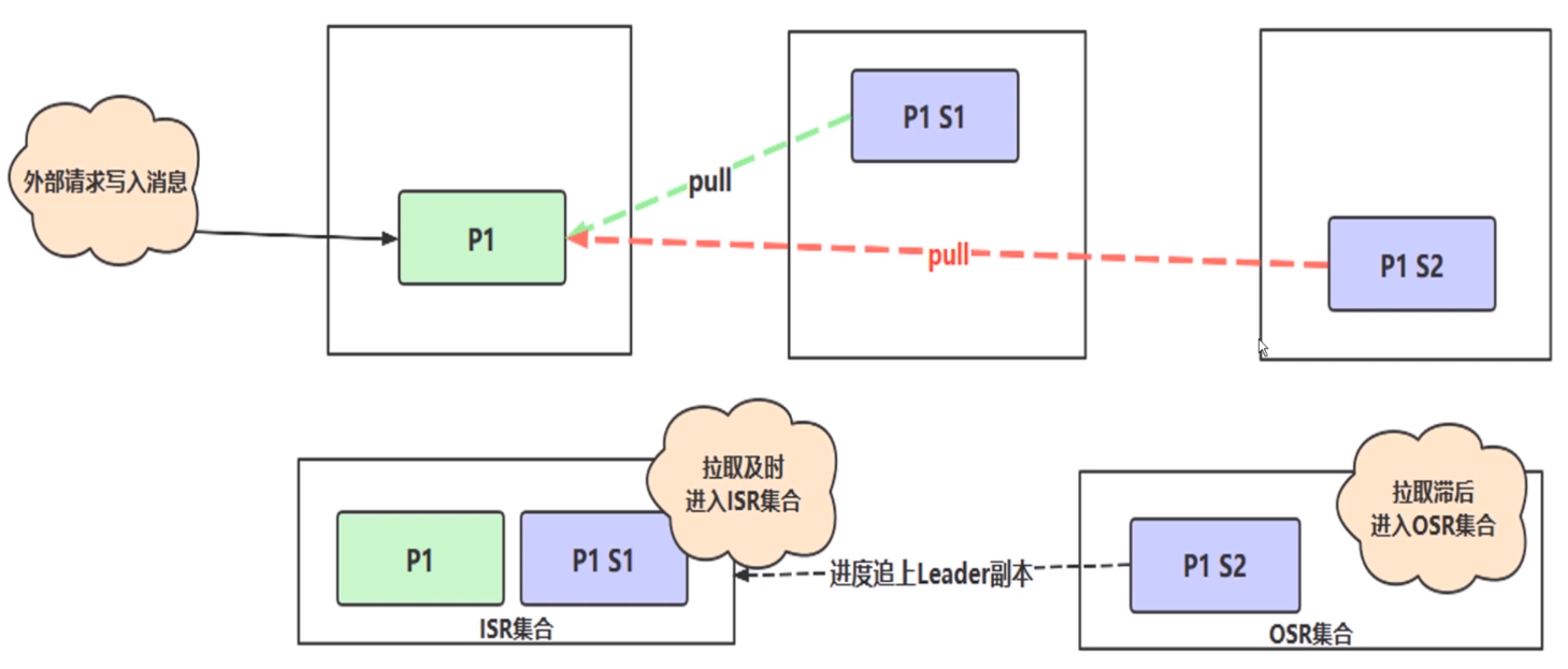 这幅图,外部请求写入信息,上面这三个框可以认为是 Kafka 的集群,绿色 P1 表示主副本,另外两个紫色的 P1 表示从副本,整个集群中有一个主副本,和两个付副本。当主副本 P1 写入完数据后,还要把写入的数据同步到 S1 和 S2上。这样就组成一个副本集,之前说的集群之间数据并非完全一致的,副本之间是一个一主多从的关系。Kafka 怎么去保证付从副本和主副本数据的一致性呢?这里就要引入 In Sync Replicas 的概念。