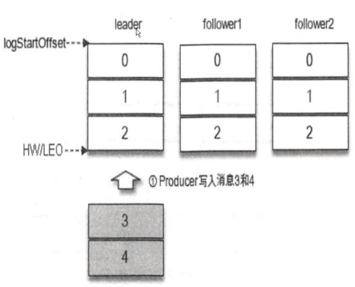 我们现在要往 3 个节点或者说一个 Partition 里有 3 个副本,主副本和两个从副本。我一条消息要写入 3、4 ,Producer 有两条消息(3、4),当前我认为 Partition 分区里面 LogStartOffset 都是 0,HW(高水位线) 和 LEO(最后文件位置) 都是 2,这种情况处于正常良好的情况,假设我现在即将写入 3、4 两条消息。