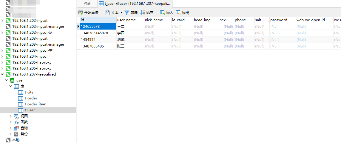 平繁刷新 t_user 表中的数据,有数据就说明成功了。这时我再关掉一台 MyCat 服务