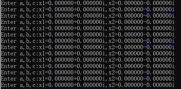 #include<stdio.h> #include<math.h> void solve(double a,double b,double c); int main(){ double a,b,c; printf("Enter a,b,c:"); while(scanf("%lf%lf%lf",&a,&b,&c)!=EOF){ solve(a,b,c); printf("Enter a,b,c:"); } return 0; } void solve(double a,double b,double c){ double x1,x2; double delta,real,imag; if(a==0) printf("not quadratic equation.\n"); else{ delta=b*b-4*a*c; if(delta>=0) x1=(-b+sqrt(delta)/(2*a)); x2=(-b-sqrt(delta)/(2*a)); printf("x1=%f+%fi,x2=%f-%fi\n",real,imag,real,imag); } }