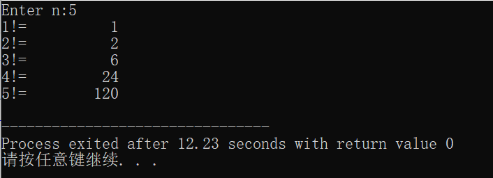 #include<stdio.h> long long fac(int n); int main(){ int i,n; printf("Enter n:"); scanf("%d",&n); for(i=1;i<=n;++i) printf("%d!=%11d\n",i,fac(i)); return 0; } long long fac(int n){ static long long p=1; p=p*n; return p; }