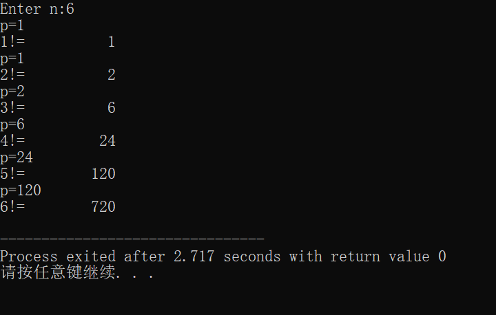 #include<stdio.h> long long fac(int n); int main(){ int i,n; printf("Enter n:"); scanf("%d",&n); for(i=1;i<=n;++i) printf("%d!=%11d\n",i,fac(i)); return 0; } long long fac(int n){ static long long p=1; printf("p=%11d\n",p); p=p*n; return p; }
