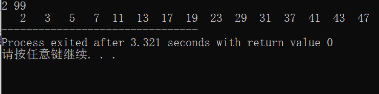#include<stdio.h> #define N 1000 int fun(int n,int m,int bb[N]){ int i,j,k=0,flag; for(j=n;j<=m;j++){ flag=1; for(i=2;i<=m;i++) if(j%i==0){ flag=0; break; } if(i>=j) bb[k++]=j; } return k; } int main(){ int n=0,m=0,i,k,bb[N]; scanf("%d",&n); scanf("%d",&m); for(i=0;i<=m-n;i++) bb[i]=0; k=fun(n,m,bb); for(i=0;i<k;i++) printf("%4d",bb[i]); return 0; }